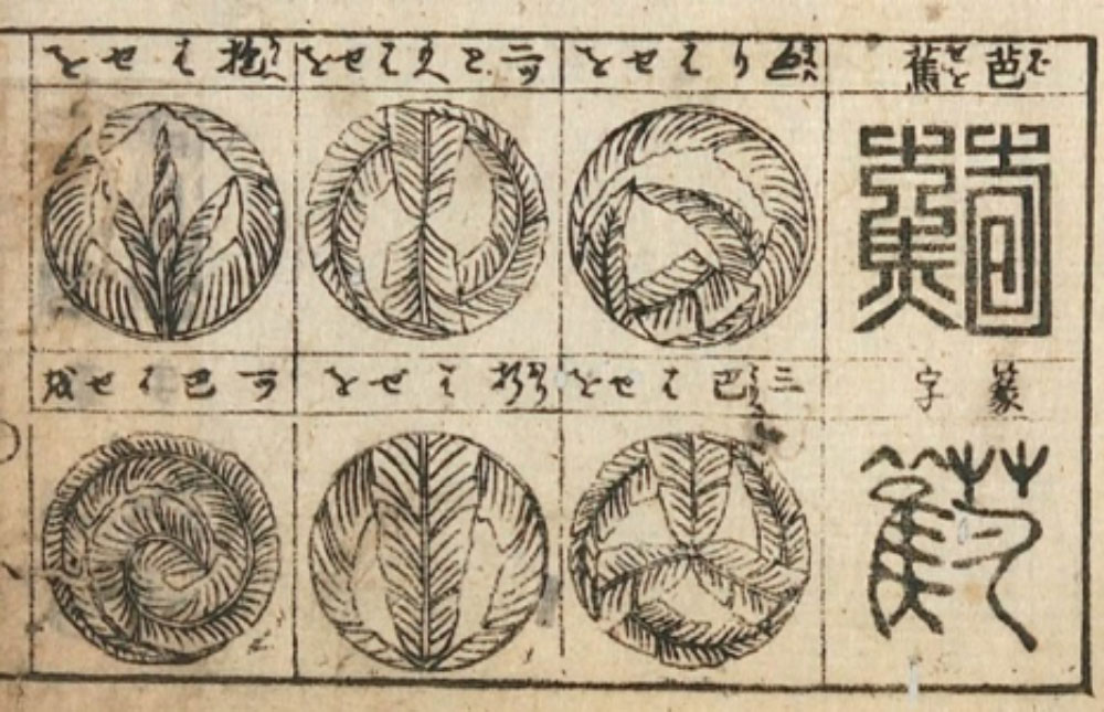 芭蕉葉は特徴的な形をしているため、紋としても使用されたようで、江戸時代に刊行された紋帳にも数種類が掲載されています。たとえば、下段右から二番目の「三巴はせを」は巴紋を芭蕉の葉で形作っています。