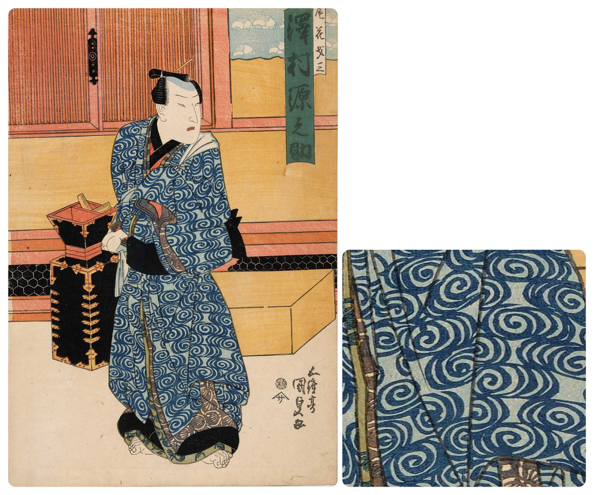 最後にご紹介する型紙は、渦を巻いた水の文様で「観世水」(かんぜみず)と呼ばれます。この文様は、能楽観世流の謡本や扇、装束などに使用されるため、この名がついたといわれています。一方、歌舞伎の世界では、歌舞伎役者の家である沢村家も観世水を使用していました。沢村家の役者が描かれた役者絵の中には、衣裳や小道具に観世水があしらわれることもあります。こちらの役者絵の衣裳がもし、製作されていたら型紙を使用して染色されていたのでしょうか。さて、観世水の型紙に目を向けてみましょう。こちらの型紙は、観世水が斜めに配されて遠目からは斜め縞のように見えますが、近づくと文様を確認することができます。観世水は「錐彫」と呼ばれる小孔を彫り抜く技法によるもので、その周囲は「道具彫」と呼ばれる、刃の形が彫り抜く形をした彫刻刀を用いたと考えられます。いずれも大変緻密に構成されていて、彫刻する位置を間違えればデザインも崩れてしまいますし、型紙としての強度も落ちてしまうでしょう。一つ一つの仕事を丁寧に進めていたことがよくわかる型紙です。(KTS08054)