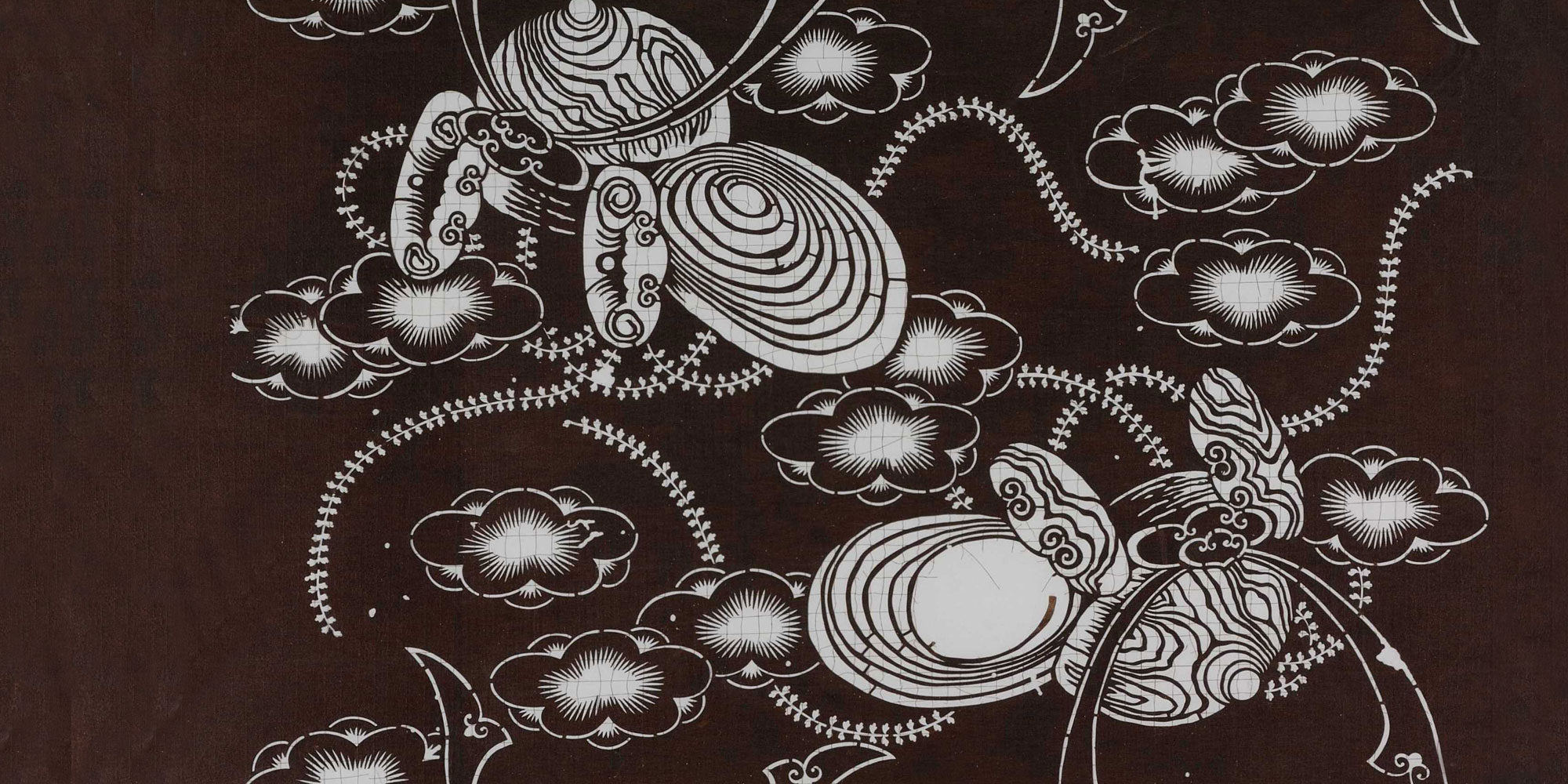上の型紙は、武具や馬具が配された型紙です。型紙上部から「鞭」、合図や命令の伝達に用いられ、大将の持ち物とされた「采配」、「弓」、「兜」、馬の口に噛ませる「轡」(くつわ)や乗り手の足を支える「鐙」(あぶみ)などが挙げられます。武具や馬具を取り合わせた男児のきものが現在まで残っているので、この型紙も男児向けと考えられます。男児の健やかな成長や将来の成功を、武具や馬具のデザインに托していたのでしょう。(KTS11900)