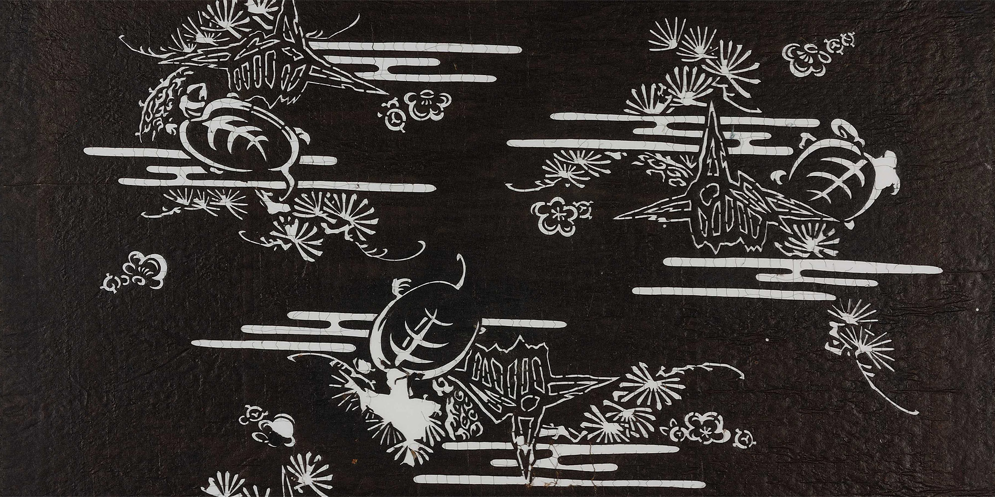 染色に使用された型紙にも鶴と亀はしばしば用いられています。キョーテックコレクションを探索してみると、現在までに鶴と亀が共に用いられる型紙は24枚、鶴のみは114枚、亀甲文様を含むものは340枚(亀のみは42枚)確認できています。やはり鶴と亀は文様として親しまれてきたことが数の上からもよくわかります。それでは、鶴と亀の型紙を一部ご紹介したいと思います。